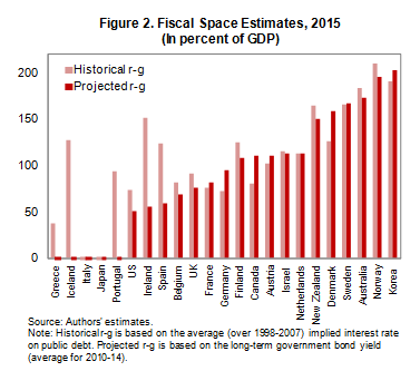 In this chart, "fiscal space" refers to the difference between projected 2015 debt levels and the "debt limit" - basically, the point at which things start to go badly wrong; so it is a quantitative measure of countries' room for manoeuvre, or scope for changing/easing policy, over the medium term.
